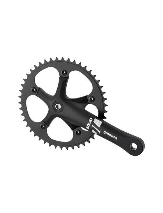 Chainwheel cu foaie de 46T, compatibila cu lant 1/2 inch x 3/32 inch. Include brat pedalier din aliaj de 170 mm, cu filet pentru pedale de 9/16 inch. Finisaj negru satin, fara aparatoare de lant si fara logo.
