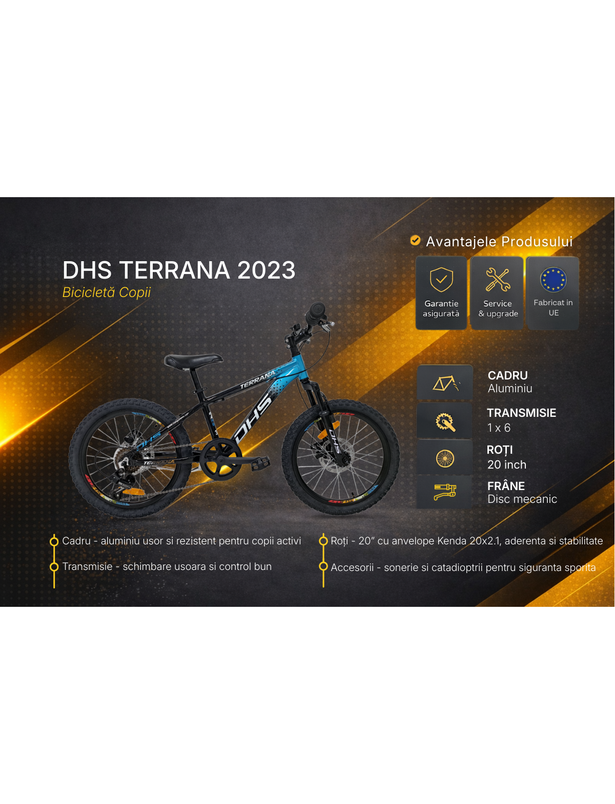 Bicicleta Copii DHS Terrana 2023, model 2026 - 20 inch este alegerea ideala pentru copiii cu varsta intre 7 si 11 ani care isi doresc aventura, miscare si distractie in aer liber. Construita pe un cadru din aluminiu de 305 mm si echipata cu roti de 20 inch, aceasta bicicleta ofera echilibrul perfect intre stabilitate, control si confort, fiind potrivita atat pentru baieti, cat si pentru fete.
