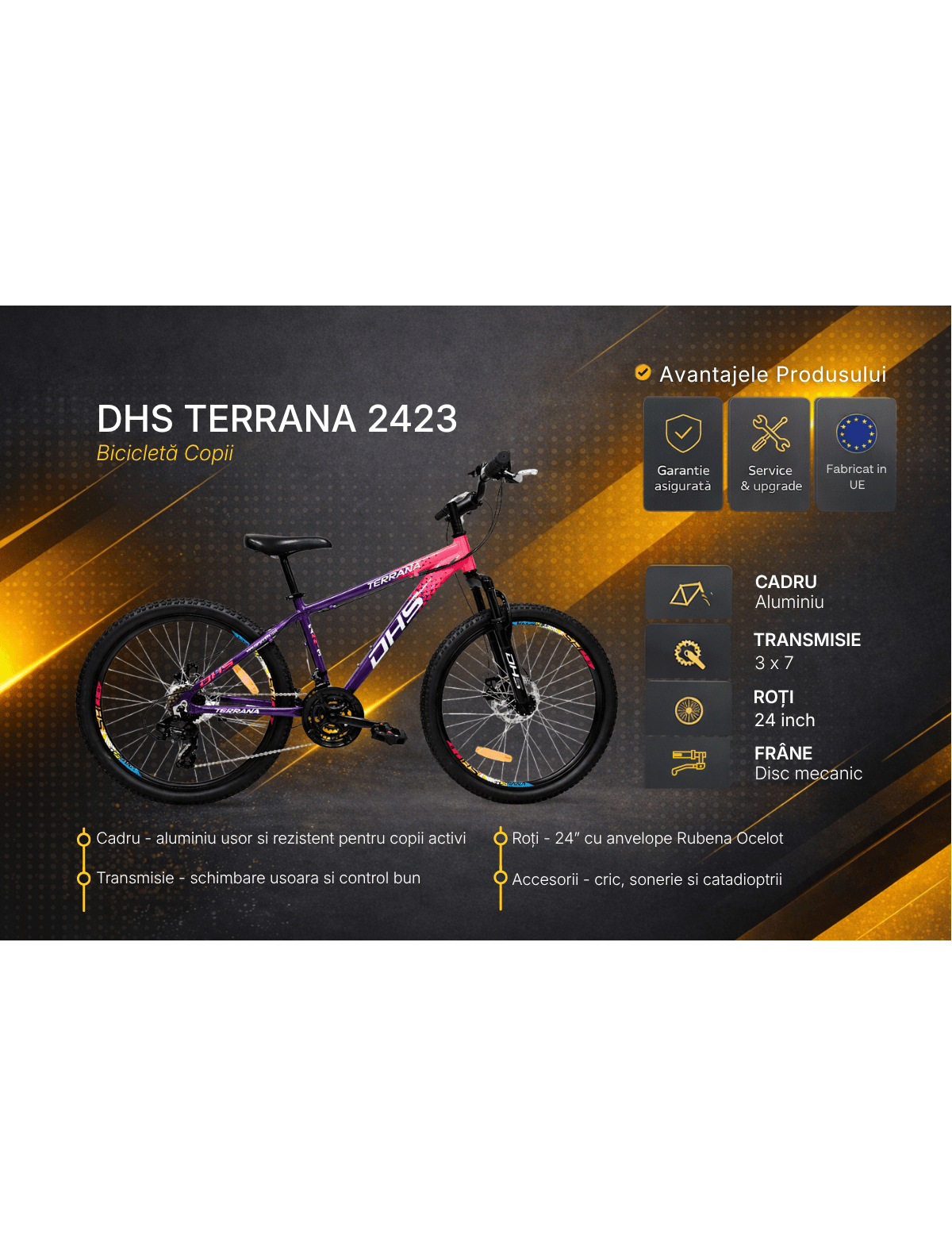 Fie ca este folosita pentru plimbari prin parc, drumuri de oras sau trasee recreative, modelul Terrana 2423 2026 este pregatit pentru aventura. Suspensia fata ajuta la absorbtia denivelarilor, iar rotile de 24 inch cu anvelope MTB ofera stabilitate si aderenta buna pe diferite tipuri de teren.