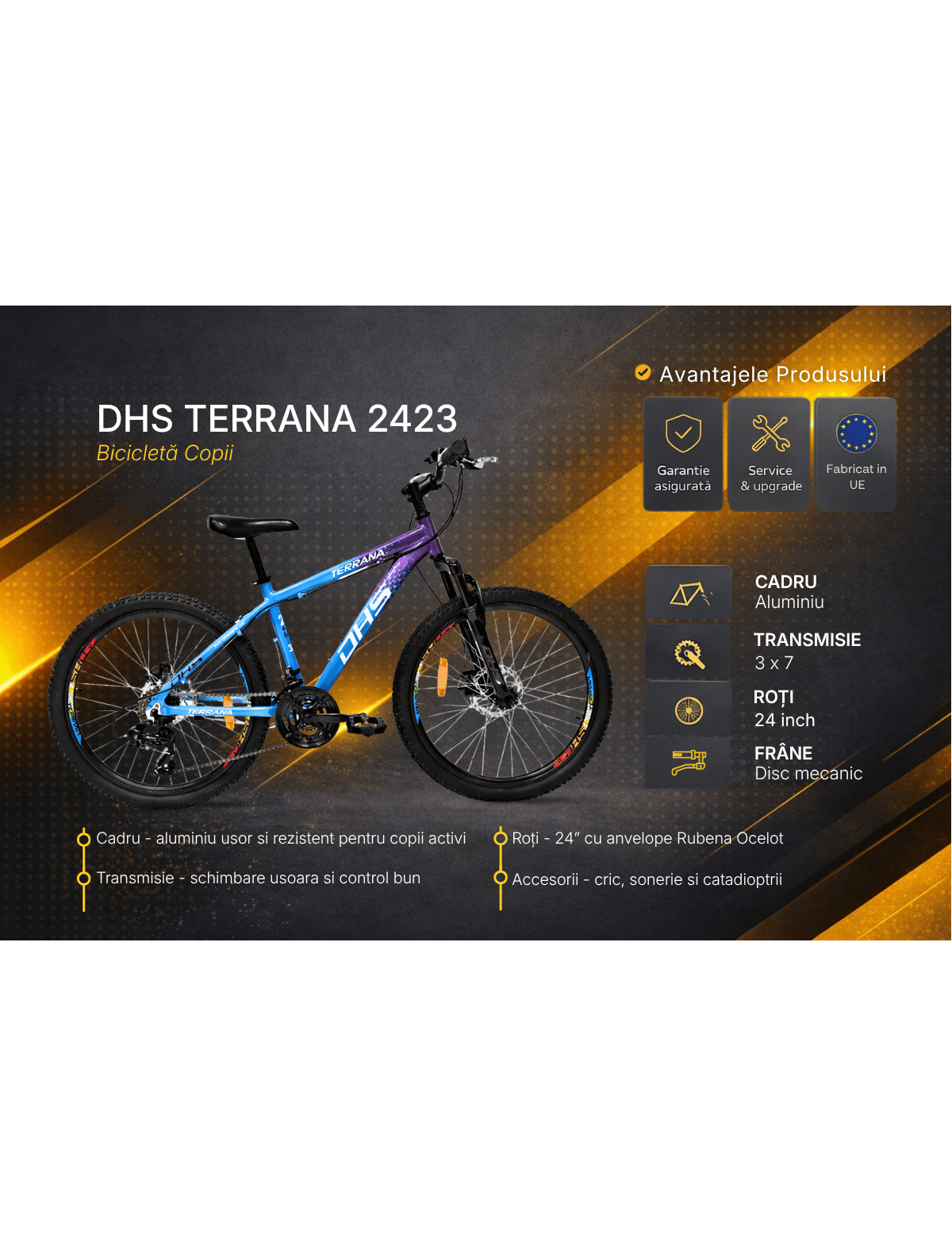 Fie ca este folosita pentru plimbari prin parc, drumuri de oras sau trasee recreative, modelul Terrana 2423 2026 este pregatit pentru aventura. Suspensia fata ajuta la absorbtia denivelarilor, iar rotile de 24 inch cu anvelope MTB ofera stabilitate si aderenta buna pe diferite tipuri de teren.