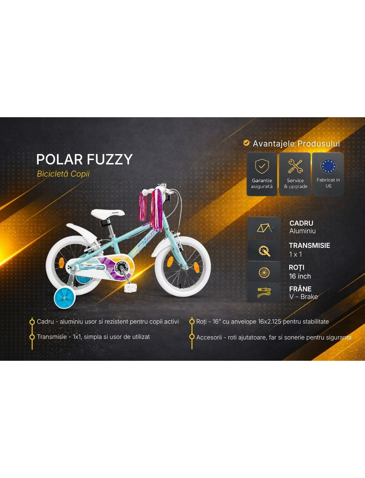 Polar Cosmo 16 Inch este o bicicleta ideala pentru copiii cu varsta intre 4 si 6 ani, conceputa pentru siguranta, stabilitate si distractie. Cu un cadru din aluminiu si multiple accesorii incluse, aceasta bicicleta ofera tot ce este necesar pentru invatarea si perfectionarea mersului pe doua roti.