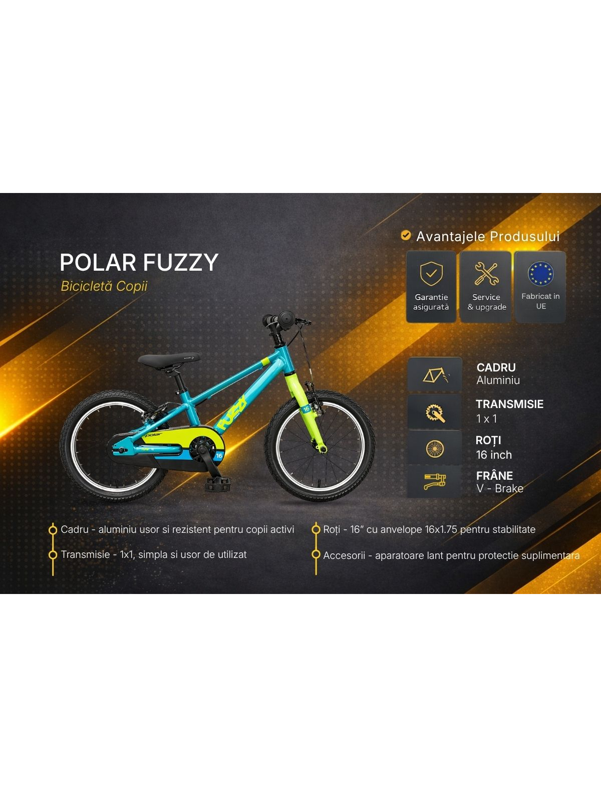 - Dimensiune roata 16 inch – ideala pentru copii 4–6 ani