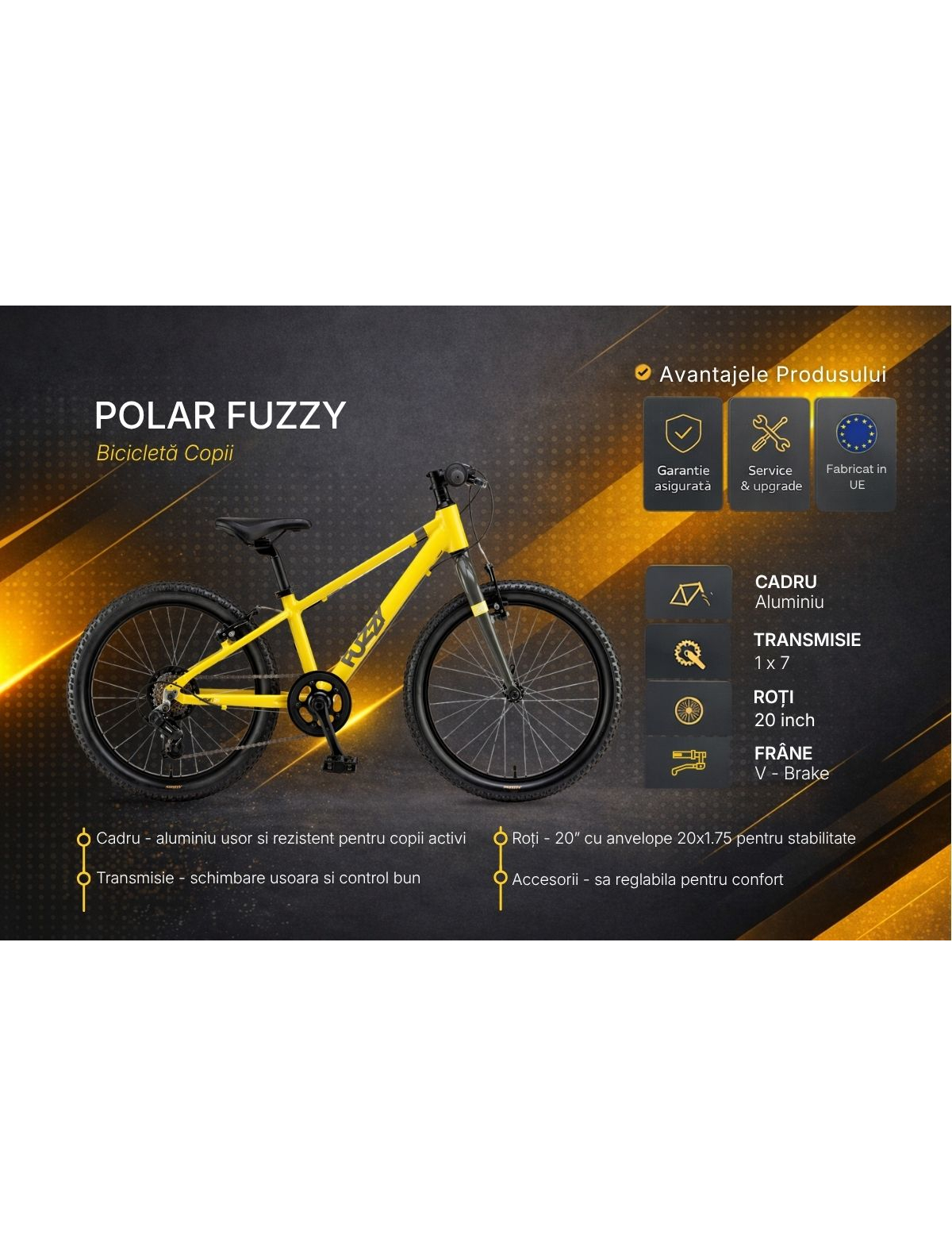 Polar Fuzzy 20 Inch este o bicicleta usoara si versatila, conceputa pentru copiii cu varsta intre 7 si 11 ani care isi doresc mai multa libertate si control in timpul mersului. Datorita cadrului din aluminiu si echiparii cu transmisie Shimano, aceasta bicicleta ofera o experienta sigura si dinamica, ideala pentru plimbari zilnice si trasee usoare.