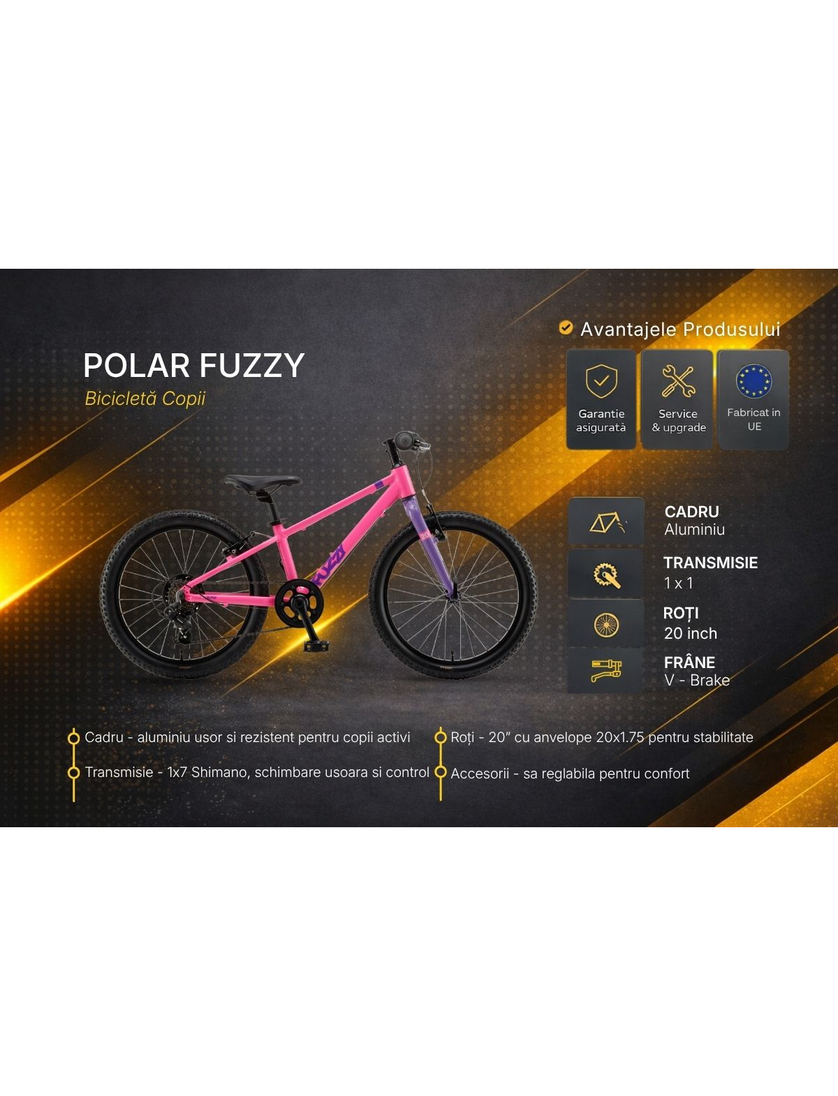 Polar Fuzzy 20 Inch este o bicicleta usoara si versatila, ideala pentru copiii cu varsta intre 7 si 11 ani care sunt deja familiarizati cu mersul pe doua roti. Cu cadru din aluminiu si transmisie cu 7 viteze Shimano, ofera o combinatie excelenta intre control, confort si performanta pentru plimbari zilnice sau trasee mai lungi.