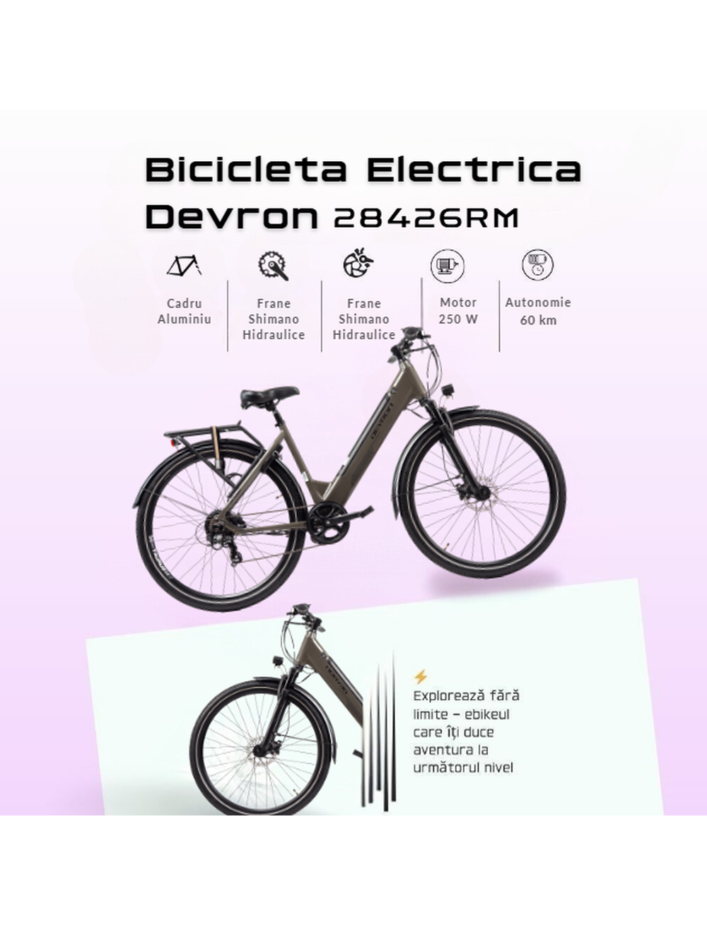 - Experimentează un nou nivel de confort și eficiență în deplasările tale zilnice cu Bicicleta Electrica Devron 28426RM - 28 Inch. Această bicicletă urbană combină un design modern cu performanțe fiabile, fiind alegerea perfectă pentru drumurile prin oraș sau plimbările relaxante din weekend.