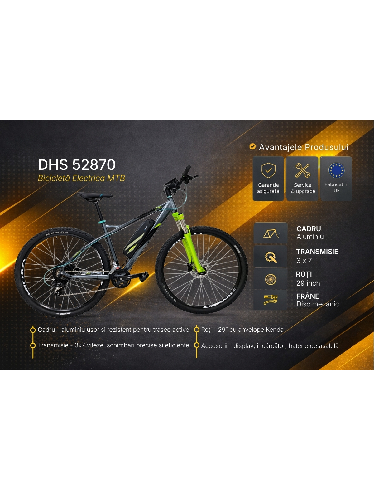 DHS 52870 este o bicicleta electrica MTB echilibrata, ideala pentru cei care vor mai mult confort, mai putin efort si libertatea de a parcurge distante mai mari. Este alegerea potrivita pentru plimbari, naveta sau explorari usoare off-road.