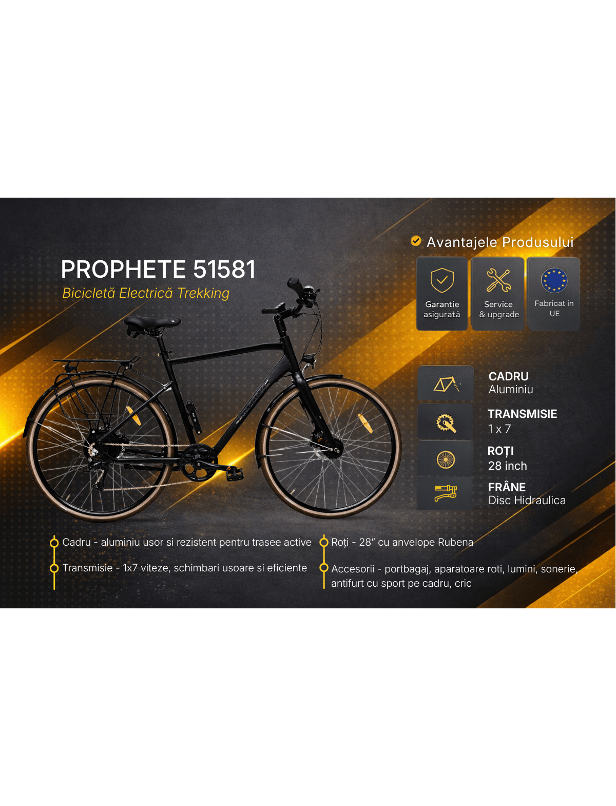 - Roti de 28 inch pentru stabilitate si rulare eficienta.