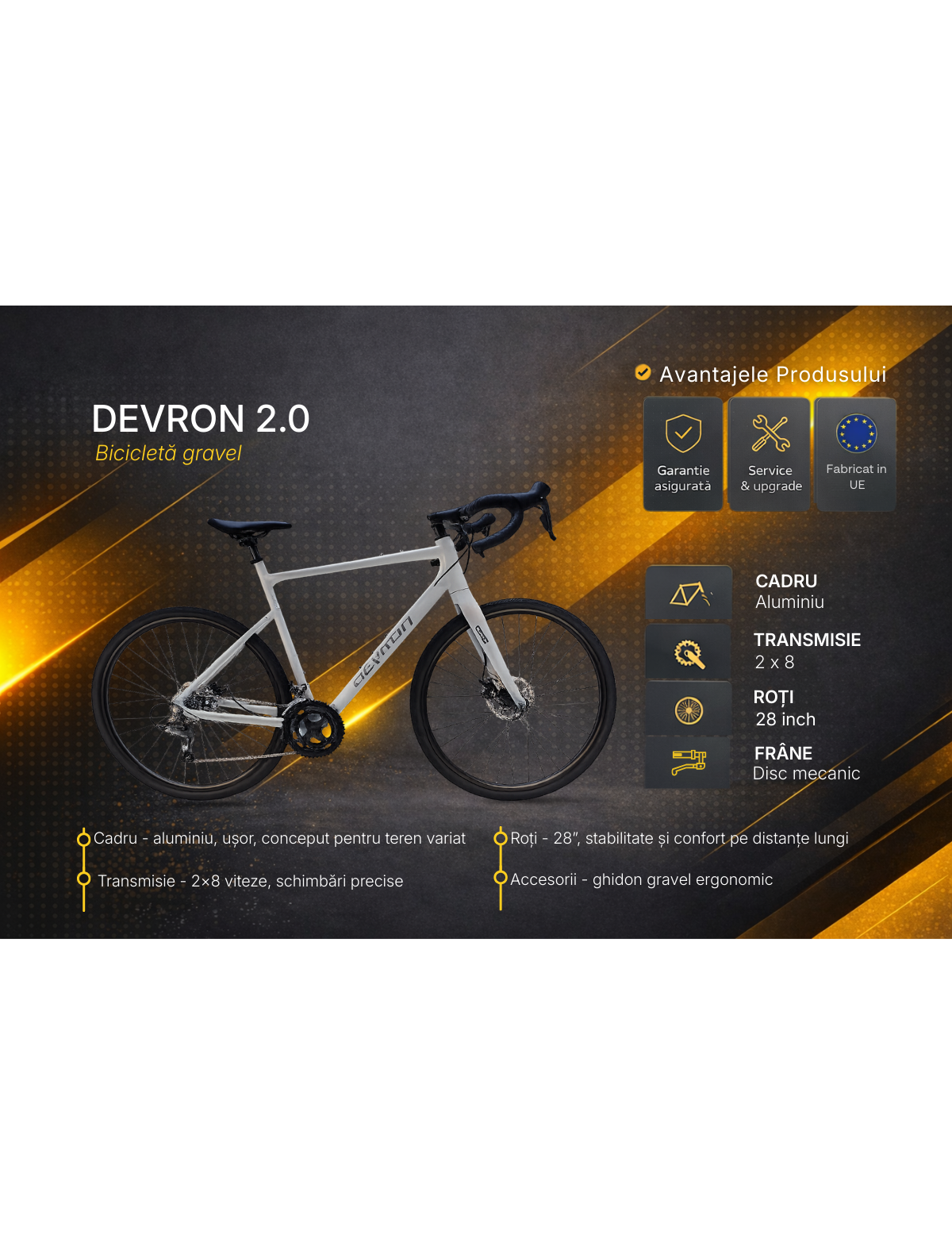 Devron 2.0 28 inch este bicicleta gravel perfecta pentru aventuri mixte pe drumuri asfaltate sau poteci usoare. Combinand confortul, stabilitatea si versatilitatea, acest model ofera o experienta placuta indiferent de suprafata pe care pedalezi.