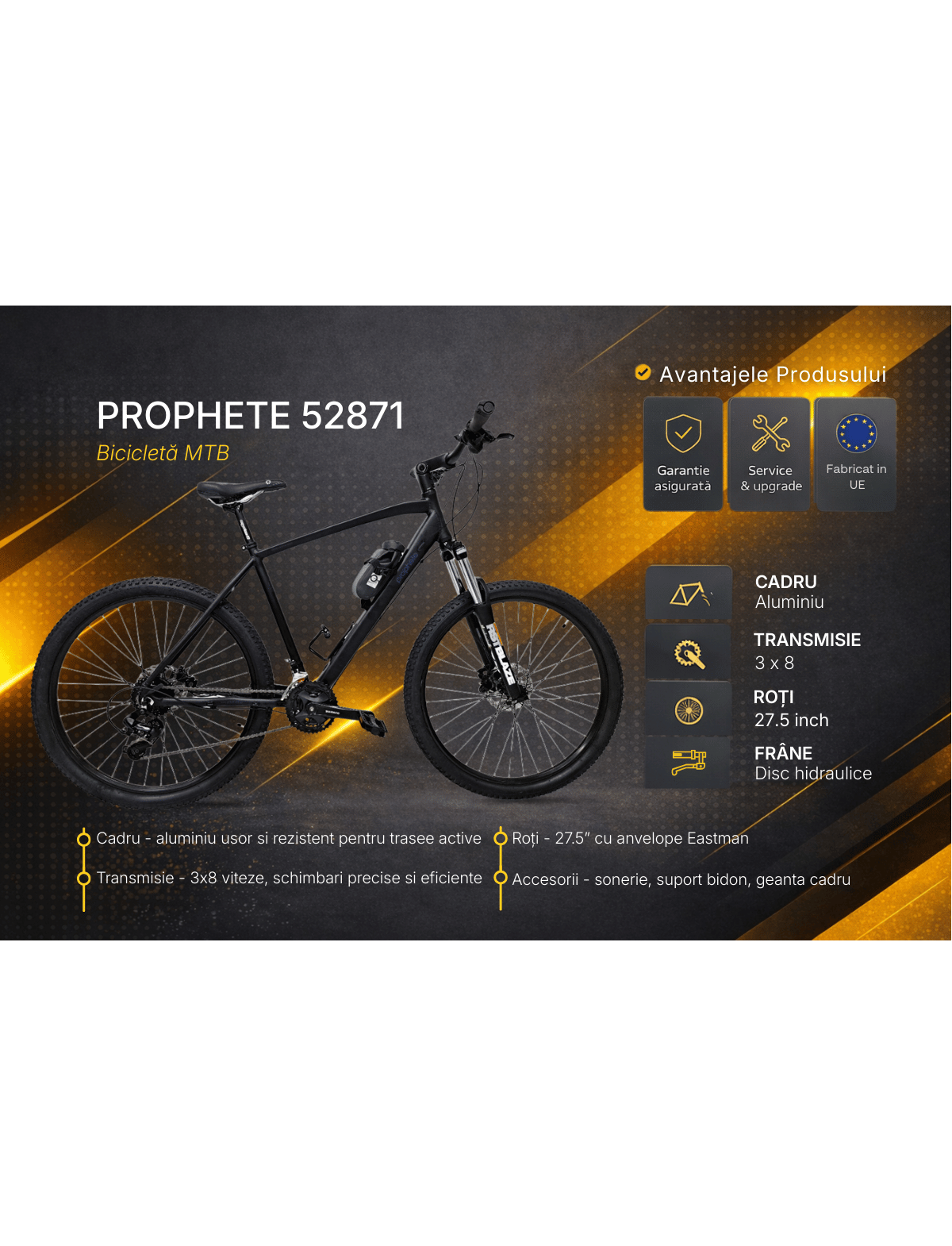 Cu un cadru din aluminiu, roti de 27.5 inch si echipare Shimano, Prophete 52871 este potrivita pentru cei care vor o bicicleta versatila, usor de manevrat si eficienta pe teren mixt.