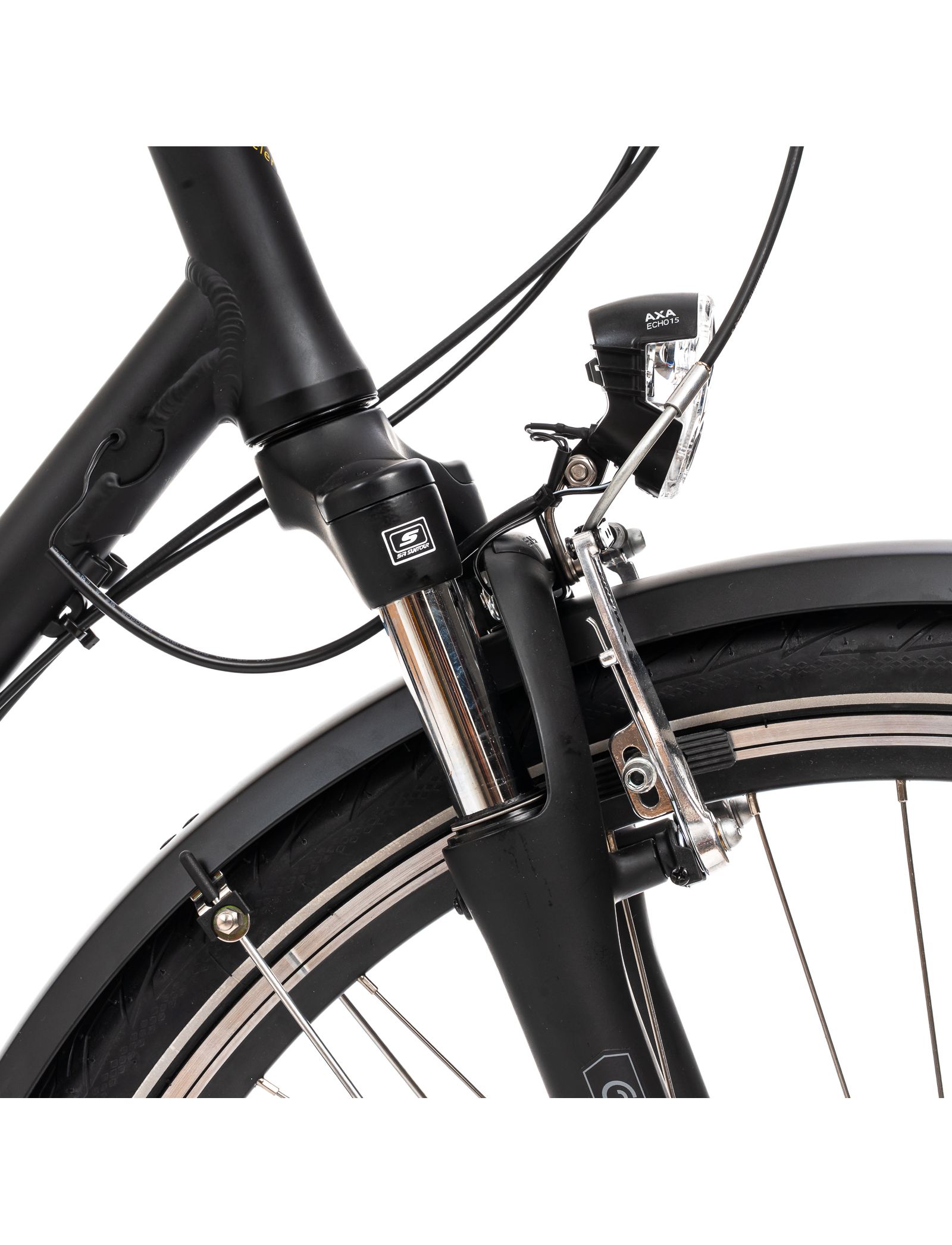 Bicicleta este proiectata pentru utilizare urbana, cu dotari complete si componente de incredere. Vine echipata cu portbagaj, lumini cu dinam, aparatori si cric, astfel incat esti gata de drum in orice moment. Cu o furca cu suspensie de 50 mm si frane eficiente, bicicleta ofera un echilibru optim intre confort si siguranta.