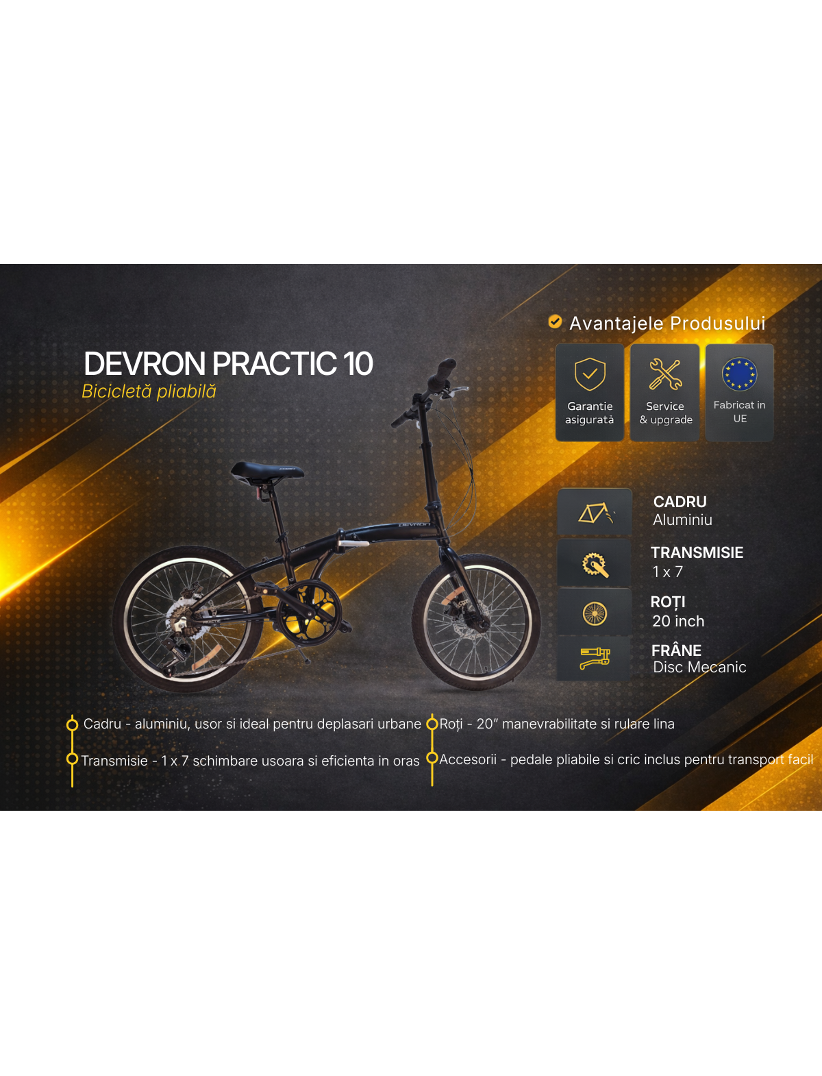 Devron Practic 10 20 inch este bicicleta pliabila potrivita pentru cei care vor mobilitate maxima in mediul urban, fara compromis la confort si siguranta. Compacta si usor de utilizat, acest model este gata sa iti transforme fiecare deplasare zilnica intr-o experienta practica si placuta.