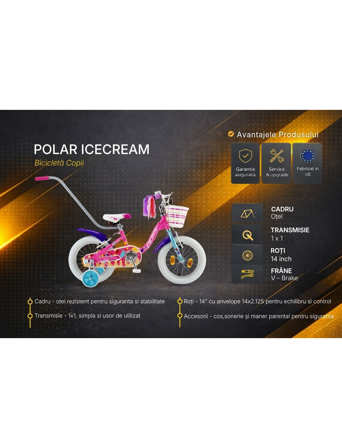 Bicicleta Copii Polar IceCream 14 Inch este alegerea ideala pentru primele aventuri pe doua roti. Cu dotari complete, siguranta ridicata si un design adaptat copiilor, aceasta bicicleta transforma fiecare plimbare intr-o experienta placuta si sigura. Alege acest model pentru a oferi copilului tau incredere si bucurie la fiecare pedalare.