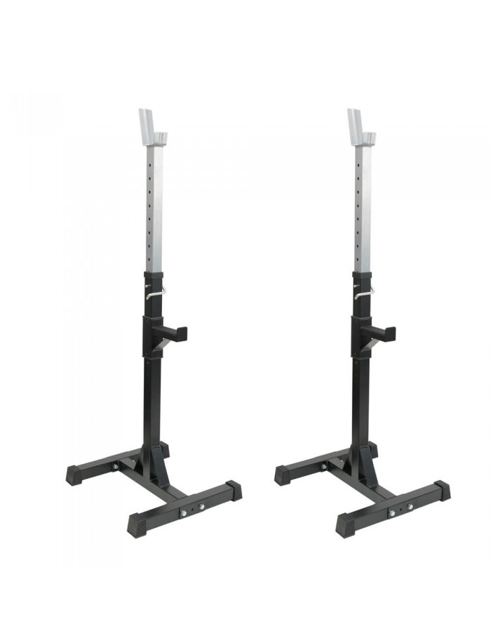 Free Squat Rack sau suport independent pentru bara olimpica este dintr-un metal puternic ce suporta pana la 200 de kg. Poate fi ajustat usor in functie de inaltimea utilizatorului sau latimea bancii. Este cadrul ideal pentru un antrenament complet acasa deoarece este dotat cu picioare antiderapante cauciucate ce protejeaza podeaua. Ofera posibilitate de reglare pe verticala de la 93,5 la 149 cm. Poate fi folosit la orice banca ca suport pentru bara, dar si fara banca, in exercitii libere. Pentru un plus de siguranta si stabilitate, folosim piulite metalice de inalta calitate echipate cu saibe interioare antiderapante.